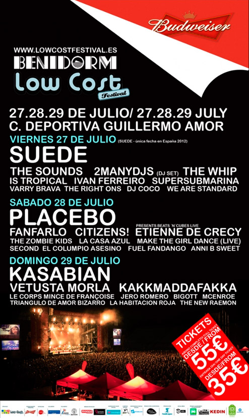 Porque esta nueva edición del Low Cost tiene un cartel muy atractivo. Desfilarán por su escenario Suede, Placebo, Kasabian, The Sounds, Kakkmaddafakka, Le Corps Mince de Françoise, Triángulo de Amor Bizarro, El Columpio Asesino, Is Tropical, Vetusta Morla e Iván Ferreiro, entre mucho otros. Tres días de buena música en Benidorm.