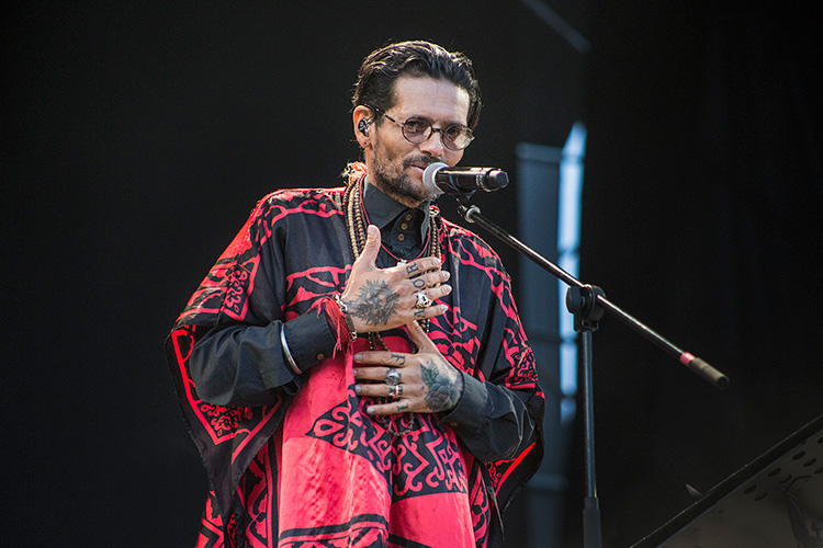 Los conciertos del cantante y escritor nuyorican suelen arrastrar más incertidumbre de la habitual pero nunca pasan desapercibidos. Su ocasión más reciente en un escenario bogotano antes de esta sorprendió por su enfoque dedicado a la música de sanación al frente de un par de tocadiscos, pero su show de la tarde noche del domingo fue un especial regreso a la canción y a su repertorio más querido. Ataviado de un poncho rojinegro y acompañado de un septeto electroacústico conformado por un trío de cuerdas tradicionales, una batería y un trío electrónico al frente de platos y teclados, que entreteje con detalle y potencia una atmósfera profunda tanto con sus temas oscuros y lentos como los densos y pesados, Draco Rosa, desplegó un show estremecedor en donde, poco a poco, se fue transfigurando en un chamán eléctrico.